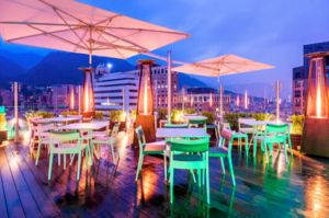 A una altura de 54 metros sobre las calles del barrio de Chapinero, el visitante puede disfrutar de esta amplia terraza y sus espectaculares vistas de Bogotá mientras disfruta de cócteles exclusivos y platos a la parrilla recién preparados.